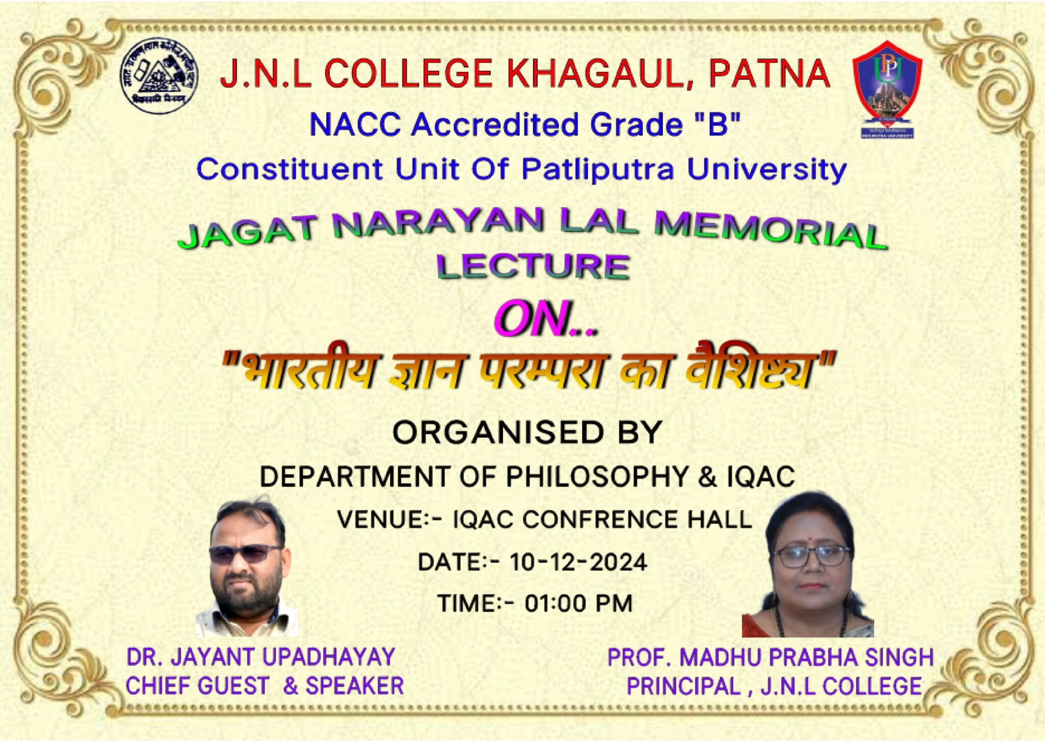 10 दिसंबर, 2024 को जगत नारायण लाल कॉलेज, पटना (NAAC मूल्यांकित ग्रेड B) में जगत नारायण लाल स्मृति विशिष्ट व्याख्यानमाला के अंतर्गत “भारतीय ज्ञान परम्परा