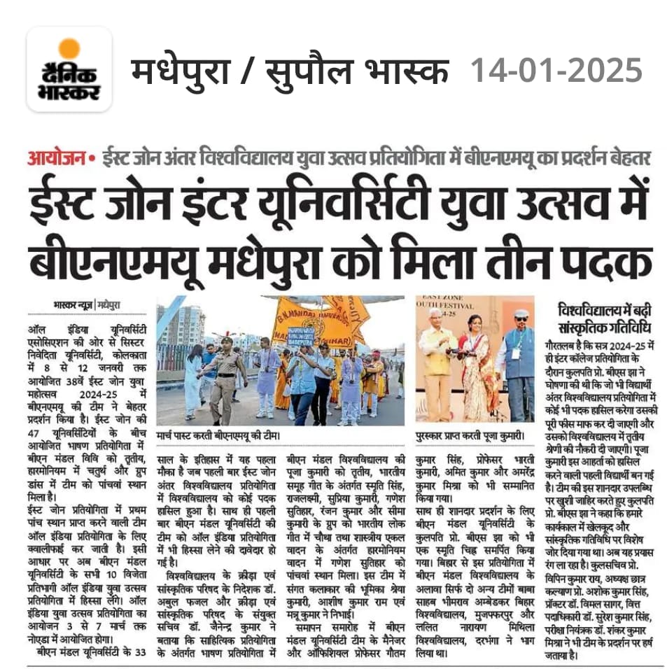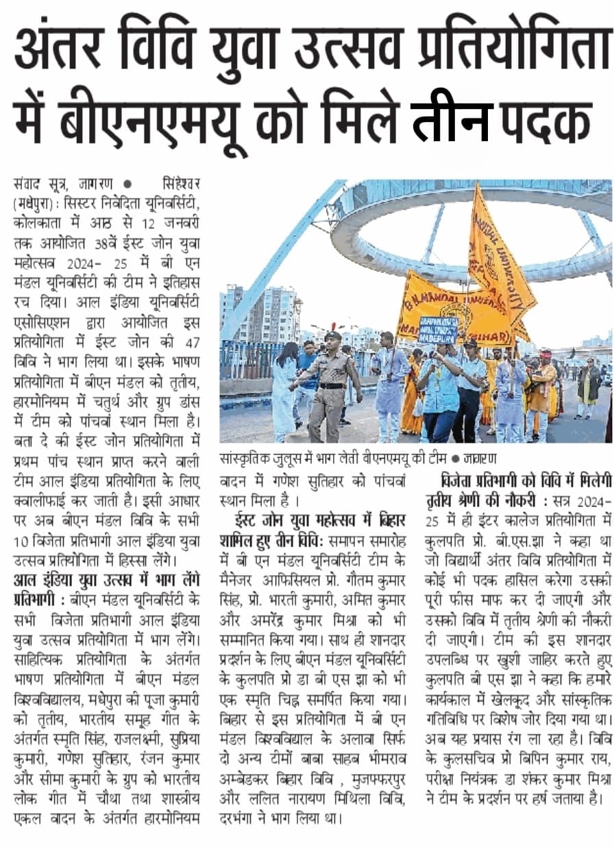बीएन मंडल यूनिवर्सिटी, मधेपुरा के 33 साल के इतिहास में यह पहला मौका है जब पहली बार ईस्ट जोन अंतर विश्वविद्यालय प्रतियोगिता में विश्वविद्यालय को कोई पदक हासिल हुआ है. साथ ही पहली बार बीएन मंडल यूनिवर्सिटी की टीम को ऑल इंडिया प्रतियोगिता में भी हिस्सा लेने की दावेदार हो गयी है.