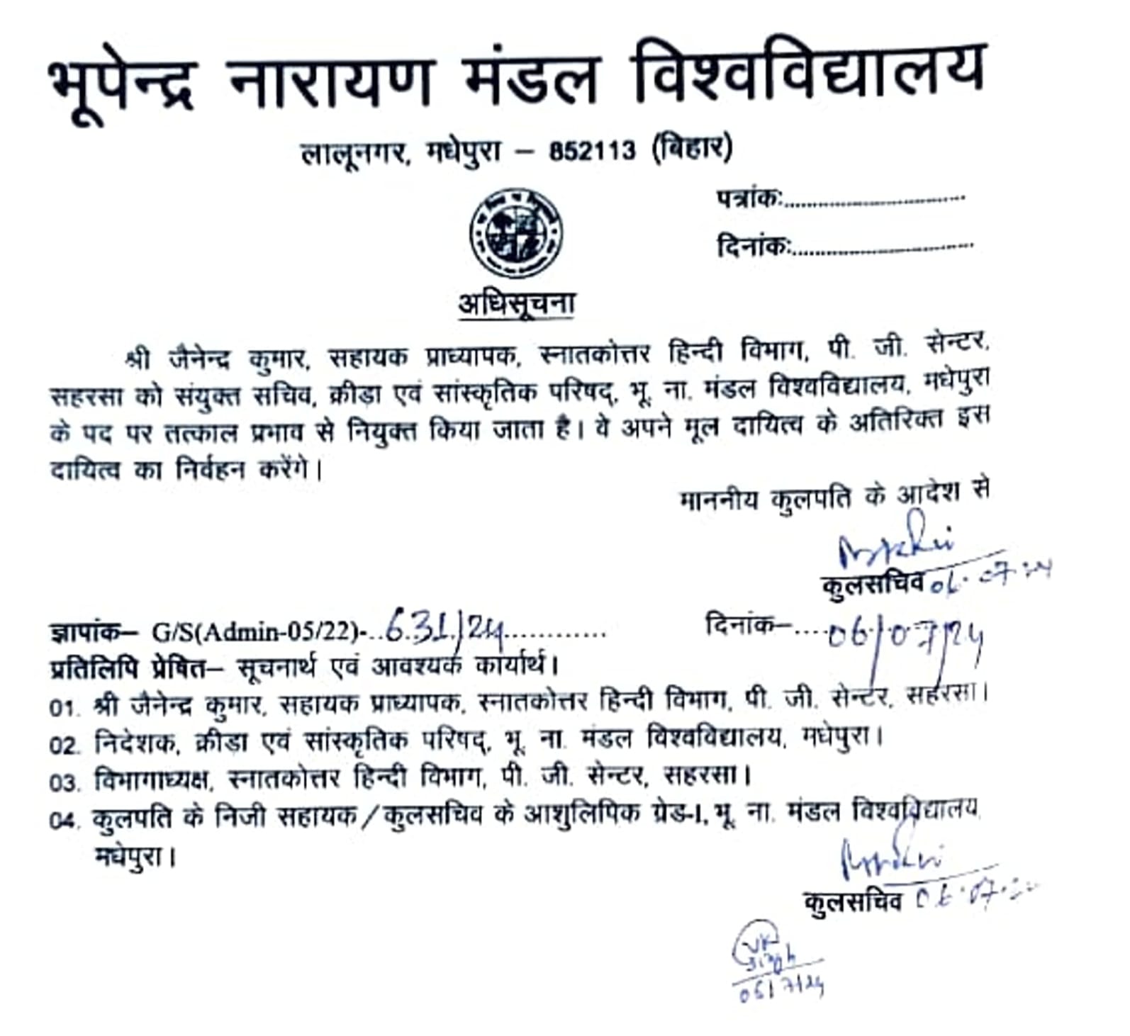 डॉ. जैनेन्द्र कुमार, सहायक प्राध्यापक, स्नातकोत्तर हिन्दी विभाग, पी. जी. सेन्टर सहरसा को संयुक्त सचिव, कीड़ा एवं सांस्कृतिक परिषद्, भू ना. मंडल विश्वविद्यालय, मधेपुरा के पद पर तत्काल प्रभाव से नियुक्त किया गया है। वे अपने मूल दायित्य के अतिरिका इस दायित्व का निर्वहन करेंगे।