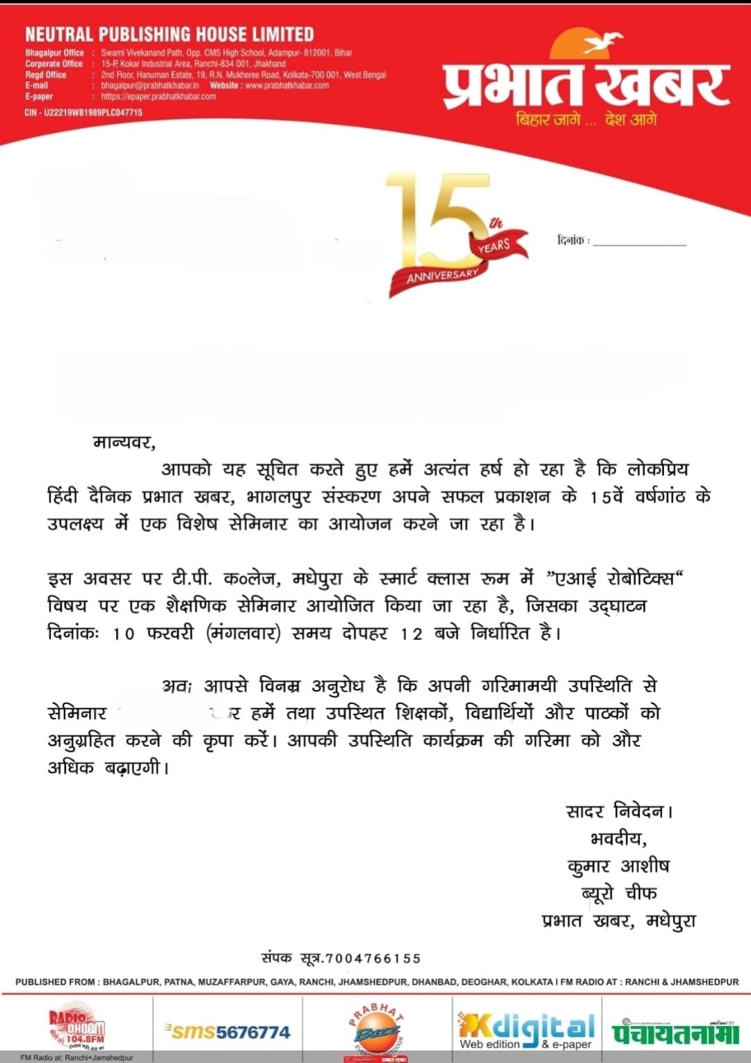 प्रभात खबर द्वारा आयोजित एआई रोबोटिक्स सेमिनार में उद्घाटनकर्ता के रूप में पधारने हेतु आमंत्रण।
